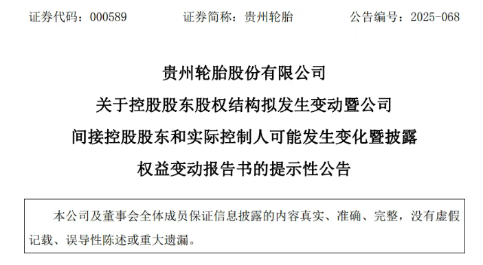 【炭黑產業網】12月18日消息,2025年12月16日,國內輪胎行業迎來一則重磅消息,貴州輪胎(000589.SZ)發布公告,宣告其控股股東股權將發生重大變動,這一變動將使公司實際控制人層級上移,開啟“省管”新篇章。