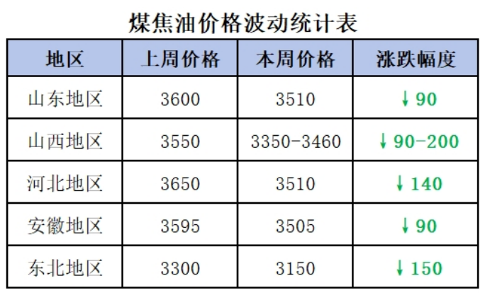 周內(nèi),焦炭新一輪降價全面落地,四輪累計降幅為200-220元/噸,焦企利潤多在盈虧邊緣,大多數(shù)焦企生產(chǎn)較為穩(wěn)定,市場煤焦油供應(yīng)變化不大。但下游深加工市場整體偏弱運行,主產(chǎn)品煤瀝青和工業(yè)萘價格持續(xù)下滑,其中工業(yè)萘已跌破5000元/噸大關(guān)。盡管蒽油部分報價略有小幅上揚,但整體仍據(jù)弱勢。深加工企業(yè)虧損下對煤焦油持續(xù)打壓,焦企守價困難。
